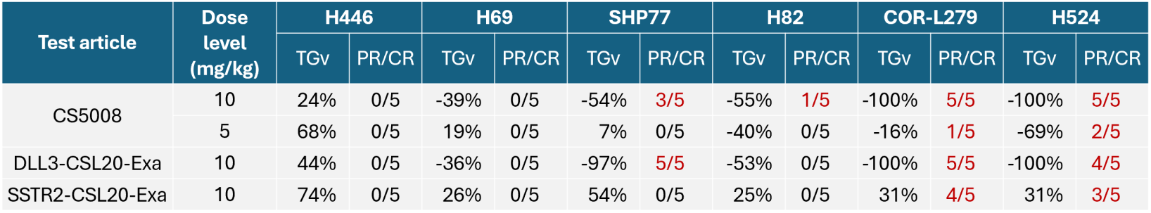 注:1)相对肿瘤生长率(TGv,%)计算公式:如Ti<T0,TGv (%)=100×(Ti-T0)/T0,反之,TGv (%)=100×(Ti-T0)/(Vi-V0);TGv<0定义为肿瘤消退。2)部分缓解(PR)定义为肿瘤消退≥30%;完全缓解(CR)为肿瘤完全消退。3)细胞系中SSTR2与DLL3的表达数据来源于内部流式细胞术检测,并经免疫组织化学验证。
