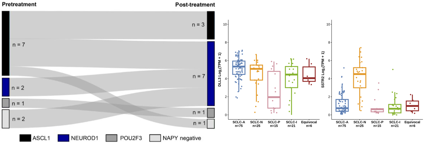 DLL3与SSTR2在小细胞肺癌(SCLC)及神经内分泌肿瘤/癌(NETs/NECs)中均高度过表达。具体而言,DLL3在超过70%的SCLC患者和64%的NECs患者中过表达;而SSTR2在超过50%的SCLC患者和约90%的G1/G2级NETs患者中过表达。因此,同时靶向SSTR2与DLL3在克服SCLC及NETs/NECs肿瘤内及肿瘤间异质性、提升疗效及扩大目标患者人群方面具有巨大潜力。尽管SCLC患者初期对化疗和/或放疗高度敏感,但绝大多数患者会在1年内最终产生治疗耐药。越来越多的证据表明,SCLC的异质性与可塑性与远处转移及化疗耐药的发生密切相关,这仍是改善临床结局的主要障碍。
