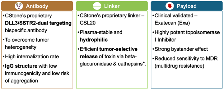 本次AACR展出的CS5007(EGFR/HER3 ADC)、CS5006(ITGB4 ADC)、CS5008(DLL3/SSTR2 ADC)皆出自基石药业自主开发的专有抗体偶联药物(ADC)技术平台,该平台具有以下特征: