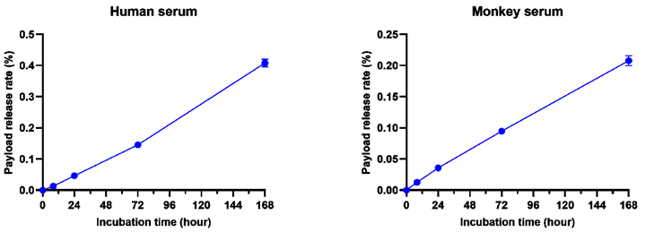 CS5008在人和食蟹猴血清中均展现出极佳的稳定性。在37°C条件下孵育7天后,其毒素释放率均低于0.5%。
