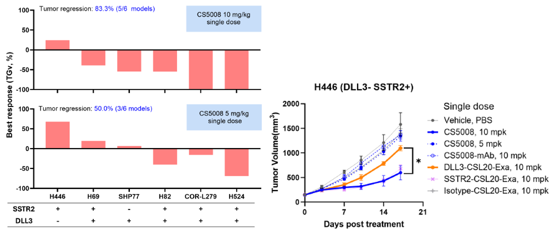 在SCLC的异种移植(CDX)模型中,CS5008表现出强大且广泛的抗肿瘤效果,尤其是在单次给药的情况下,就能在不同抗原表达水平的多种肿瘤模型中诱导肿瘤消退。CS5008在DLL3阴性的H446 SCLC CDX模型中展示出优于DLL3单靶向ADC的药效,显示出CS5008对于克服肿瘤异质性的潜力。